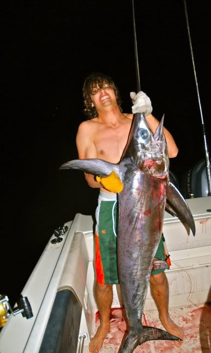 A couple hours in I start to get restless. I yell "COME ON SWORD!" and I kid you not... a second later the rod starts to scream. I have the drag set a lot looser this time.. so we end up fighting for a while longer then we should have.. but the hook doesnt pull.. and WE"VE GOT OUR SWORD!