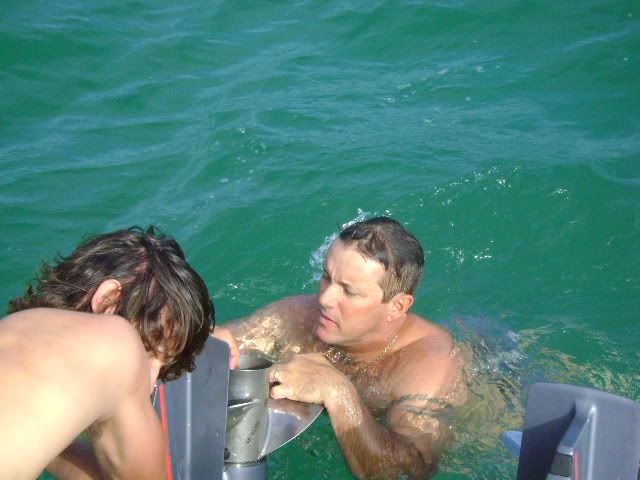 Met up with Kenny ,Colby and Eddie for a day of offshore fishing.We started the morning by catching plenty of live herring on the sabiki's .After anchoring up next to seven other boats on Bug Light we set out a chum bag , filled our live well, and headed to fish a spot 25 miles south of Fowey rocks close to the whistle bouy.We quickly had to adapt because Murphy's law came into play right away .We had a problem when the starboard(right )propeler blew a hub.I always keep the most important of spare parts on board so off with the clothes and into the water i went to remove the prop and replace the hub,,,,,,,,not an easy job from a boat that's bobbing around.We made the best of our situation because after replacing the hub we were up on plain and the hub on thge left engine blew out and was not willing to cut up my hands anymore on this day so we fished close bypn 135 feet of water where we marked some very rocky bottom.