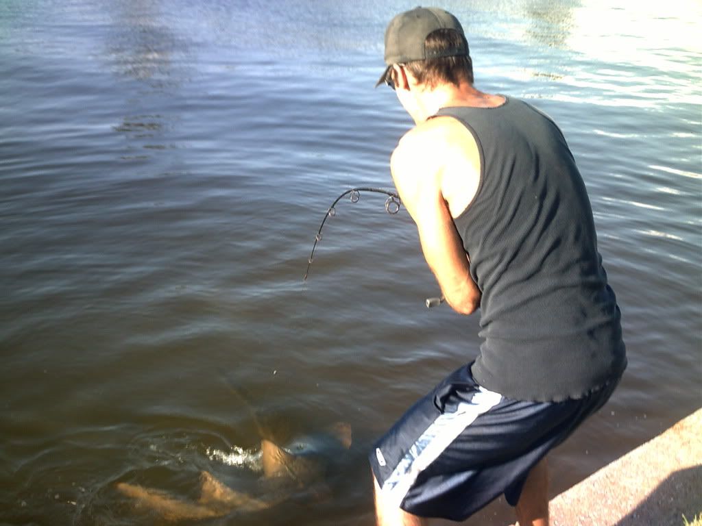 I haven't posted in a while but I've caught some decent fish, this one was out of the ordinary so I will post it..I wanted to go to the beach today to try and get my leader back from the hammer that cut me off..but the wind and waves had other ideas. I decided to stay close to home and hit up my tarpon and big snook spot. I am on my 4th tarpon this year, 1 landed, 1 jumped, 1 was hooked on my snook rig, a 12 lb class spinning reel and I was trashed..all these fish were in the 80-120 lb range. I learned today that sawfish don't fight as hard as tarpon, but this was still a challenge on my 12 lb spin gear. I had a couple spinning rods out fishing for tarpon bait as well as snook..I was using cut needlefish. I also had 2 tarpon rods out some 2/0 and 3/0 reels which didn't turn a click all day. I caught quite a few catfish which I was using for tarpon bait, I would have preferred mullet it seems like that is what they have been preferring at this spot. One of my spinning rods takes off and when I set the hook I could tell it was no catfish..I could feel way more weight than what this gear was meant to handle. Eventually I stopped the fish and fought it to the seawall..my other spin rod went off and I was worried it was another sawfish. I layed off the drag on my spinning reel with the sawfish on and layed it on the ground then ran over to my other rod, caught and released the catfish on it, grabbed my camera and tried to get evidence of my catch. Luckily a guy was walking his dogs and helped me get some pics and I took some video myself while I fought the fish before the guy showed up. After I got some evidence I popped off the sawfish. Later on in the day I hooked a 18-20 lb class snook, swam under the dock I had to put my rod around the piling and out the other side to stay hooked up, it swam around another piling I pass the rod to my dad who met up with me later on he grabs it and brings the rod out from under the dock and now he's fighting a big snook, it then charges the dock fast and cut us off...here is my sawfish, I really guess that now at this point a big hammer really is the last species I will be able to scratch off the list I hope it is soon....