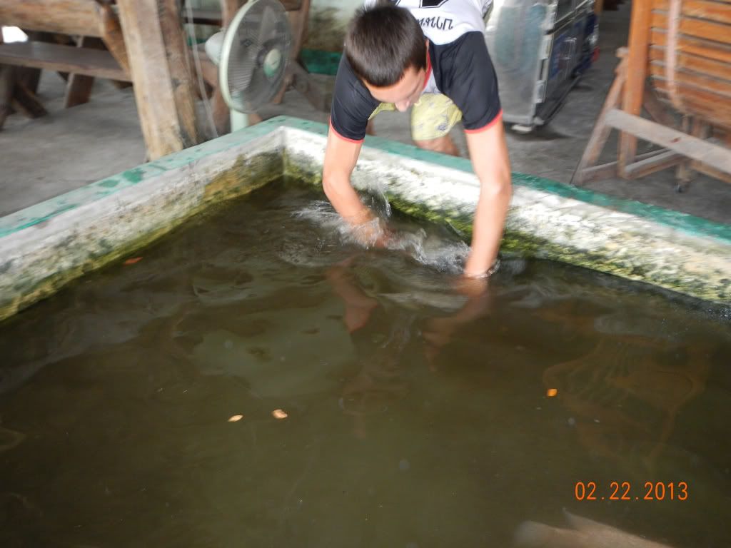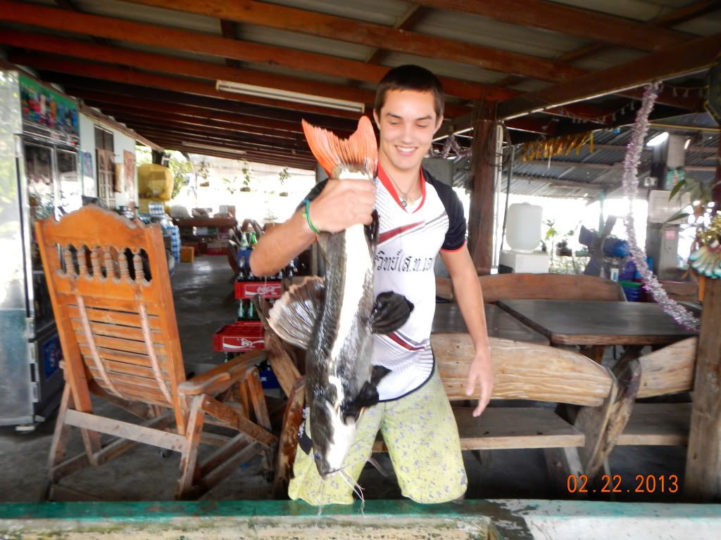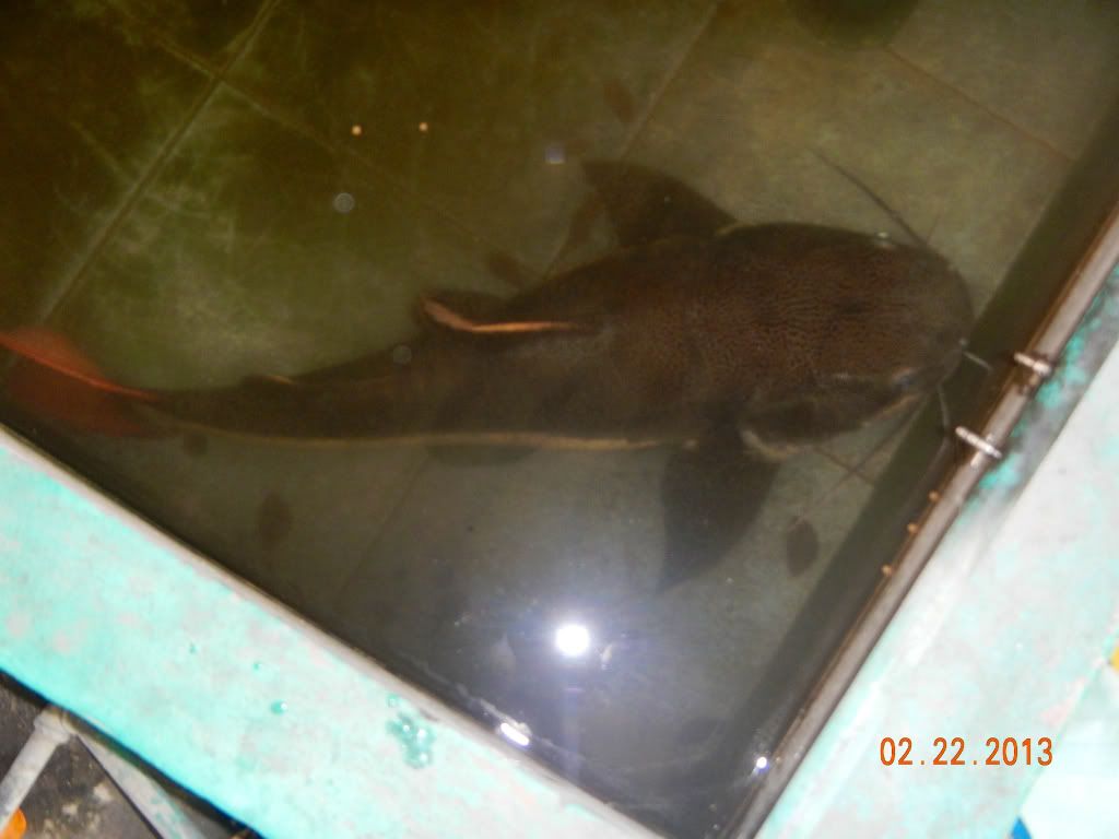 A shrimp shop owner had a Amazon Red Tailed Catfish in his fish pond.