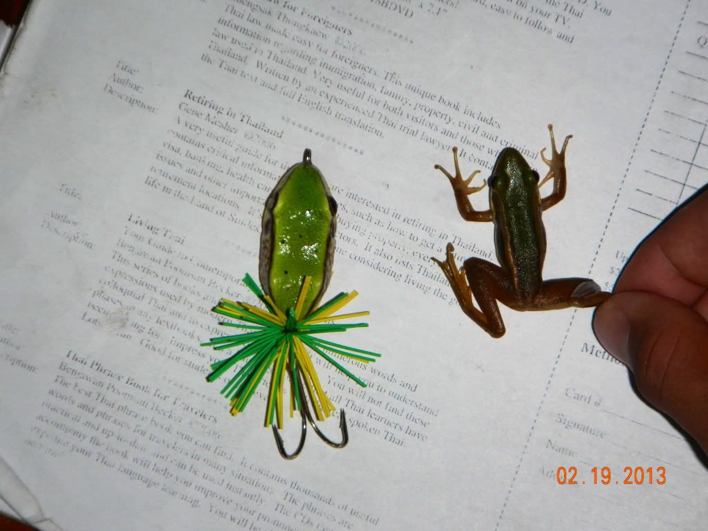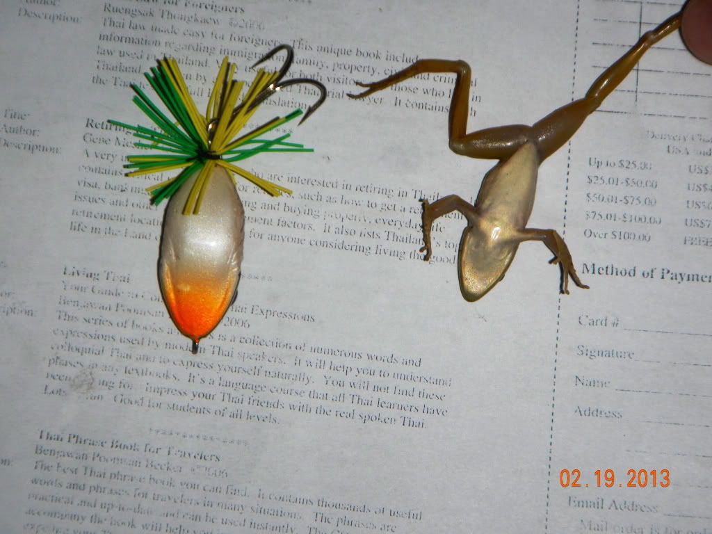 Good Luck ,& Have Fun!Ya the frog is where it is at the two best baits (so I am told I fish lure almost exclusively for them) are frog and eel.