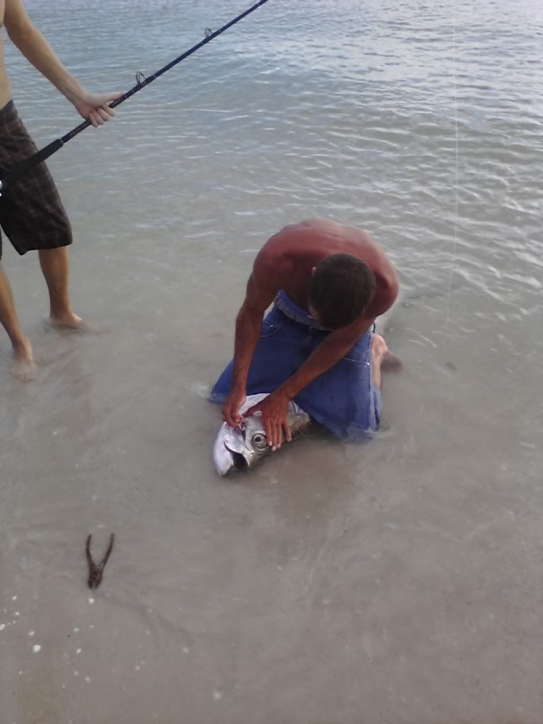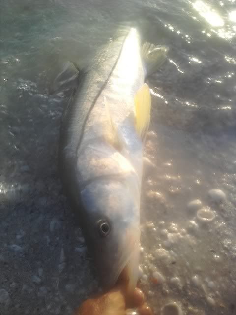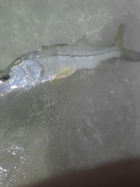 I was able to hook about 20 of them, but missed several giant snook by not getting to the rod in time..I just flip out two spinning rods with ladyfish chunks about 20 feet from the shoreline and let them sit..sometimes there is more action than you can handle. Didn't get any runs from the sharks all day but I did get this instead..