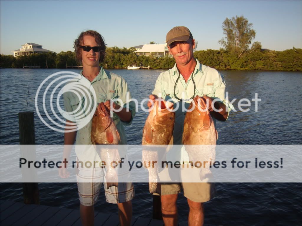 My family went down Friday to our house on Palm Island. Plans for the weekend were to go offshore both saturday and sunday and do some diving and fishing. Friday evening I got a 28" snook within a few minutes and then had to start rigging the rods for saturday. The weather forecast for both days was for 2 ft seas, uhhh yeah right! They ended up being 2-4ft seas and the occasional 5 ft wave that made the trip out on both days rough. On saturday my father and I headed out 20 miles and on a very large swiss cheese bottom area we released about 30-40 red's and a variety of a flounder, grunts, and other things. On that area I got a 22 1/2" Red and my dad got a 26" and a 25" Red which were pigs compared to mine. Then we headed out to a spot at 23 miles in 81 ft. of water and anchored again. All that seemed to be there were tons of juvenille reds. We also picked up 4 keeper lane snapper and 2 large grunts between the two spots. While at the 23 mile spot I noticed a few remoras hangin around and not after long a 5' Tiger shark popped up behind the boat. I didn't have anything ready for a shark so I took my pitch rod with 40lb mono leader and tossed him half a blue runner. He swallowed it and didn't fight at all at first. Got it right to the boat and my dad was gonna bring it in until I said I don't want to bring in a fresh shark since all he will do is flop around. So it finally started fighting and was fighting like a champ for just a 5' shark. After about 5 minutes he finally got through the leader and I lost the Tiger. It was still fun just having the chance to fight a tiger shark. The seas started getting rougher so we had to call it and made the run back to the dock. On Sunday my sister joined us and we went out 22 miles to Boxcar Reef. It's the first time I've ever dove down at our island house and first solo dive in more than 40ft of water. The visiblity was about 20' and I had a bottom time in 75' about 35 mins. As soon as I got to the bottom I was surrounded by 30-40 lb AJ's and I was about to pull the trigger on my speargun when I remembered that the AJ season was closed early by whoever manages those laws. So I didn't feel like getting fined today so I moved on and checked out a lot of the boxcars and other wreckage. There were 30 lb cuda's everywhere as well as hundreds of 15 lb jack crevelle and thousands of mangos sitting on the boxcars. I only saw 3 grouper and they were between 18" and 10". At one point I was caught between two 350lb goliaths that had 2" bait going 10' every way of them and I was stuck between em' in all that bait. When I was peeking below a boxcar looking for a grouper to shoot I had a goliath sneak up behind me and when I turned around I was amazed at the size of this one. It's the biggest goliath I've ever seen while diving and had to have been 600lbs based on it's gut and shear size. I felt smaller than I've ever felt when I was sitting there. To try and scare it off so the mango's would come out again I poked it with my speargun on it's side and I freaked out when it grunted. I didn't know they grunt until that happened. I was probably 50' away within 10 seconds of that thing going ballistic on me cus' I had no idea that when they grunt it sounds like the sonic boom of a space shuttle right next to you. My dad wouldn't let me take a stringer down for my fish so he said I would of had to bring up something immedietly if I shot it. So I was running out of time and started focusing on shooting a big mangrove snapper. But with the 3 goliaths around now all the mangroves got skiddish so I went up empty handed. All in all it was my #1 artifical reef dive I've ever had and the #2 overall just behind Molassas in the Keys. My father and sister dove after me and I gotta say I really like solo diving more than being with a buddy cus I don't have to watch out for some other person and go up when that person runs out of air since I swim fast and don't breathe as much as the rest of my family. Next time I go down in a few weeks hopefully I'll have a shark report. This might sound weird but I heard from a guy at a dive shop down there that there were still a few big hammers hangin out in boca still as well as quite a few tarpon. Everything this year except the cobia down there has been like a month late this year. Only a few pics were taken and that was at the dock and my mom took them and she doesn't know how to use my camera so the fish after being frozen look really small. My dad is leaving Tuesday and I know has caught a few big redfish off the dock and will probably end up with a few snook and another red or two and a few grouper off the dock by the time he leaves tomorrow.