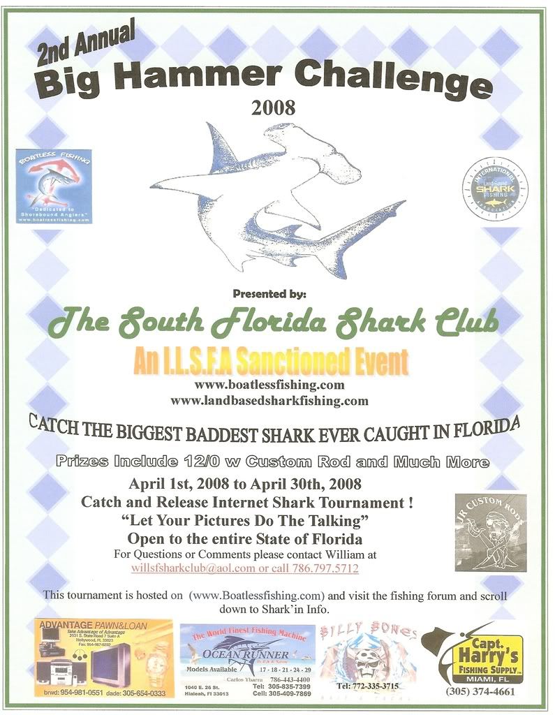 This tournament is brought to you by a group of extraordinary anglers in a specialized sport who live for the thrill of tangling with the biggest sharks in the world.Again i will state that there is only two reasons we put this tourny together every year,to compete and foremost for the love of the sport. We’re really aware of the monster hammerhead sharks,huge tiger and bull sharks that come in to feed close to our shores this time of the year.therefore it is now that we feel is the best time of the year for this tournament. The world record hammerhead shark was broken 2 years ago with a 1280 lb hammerhead caught at Boca Grande Pass on a boat after a five hour fight. There are sharks around the inlets, bridges. and beaches that size and bigger but to catch one from land is where the true challenge lies. Many tried few have succeeded. Many of us old timers in the South Florida Shark Club have had 14/0s and 16/0s packed with 130 lb test line stripped of line down to the knot on beaches piers and bridges like Bahia Honda, Seven Miler, Long Key, Channel Two, Channel Five, Indian Key. We hope to see some real hardcore shark hunters step up and show who is up to the challenge