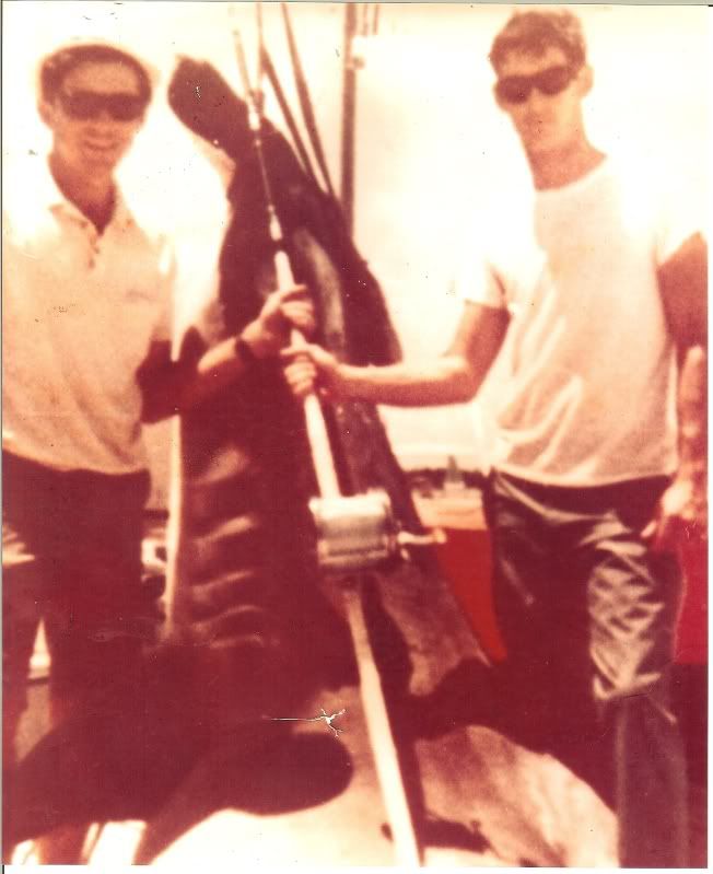 That is one of only a handful of huge hammers that have been caught from a keys bridge.In comparison Shannon's 12 foot 2 hammer only weighed 531 lbs half the weight of Mostler's 1007 lb behemouth. Those are the hammers that frequent places like long key bridge ,sevem mile bridge,Bahia Honda bridge,Boca Grande pass and a few other places during the height of tarpon season every year.The two in the picture above with the 1007 lb Hammer are Mike Simonds and Robert Mosler I was lucky to meet Mr Mike Simonds in person at Fiesta key rv campground In long key Florida last summer(2009).Pure coincidence but today Luis Iglesias called me from bass pro shop in Islamorada where he was buying shrimp as usual on Tuesday morning (his day off) and was wearing his shark club shirt and met a gentleman by the name of Capt Tony Lea who was in the Palm Beach Sharkers back in the 1960's and he knew the two guys that caught that 1007 lb hammer at Long key bridge.Apparently capt Tony Lea has alot of shark fishing history he fished with Herb Goodman when he was a young man and also knew Lee Caman who caught the 1060 lb Tiger shark at channel 2 bridge in 1969.The guy has a collection of shark fishing pictures from back in the day and I'm working on setting up a meeting to copy his pictures and write his stories ,,,,maybe we'll have another Florida shark fishing legend to join us on this site very soon .Small shark fishing world Indeed!!