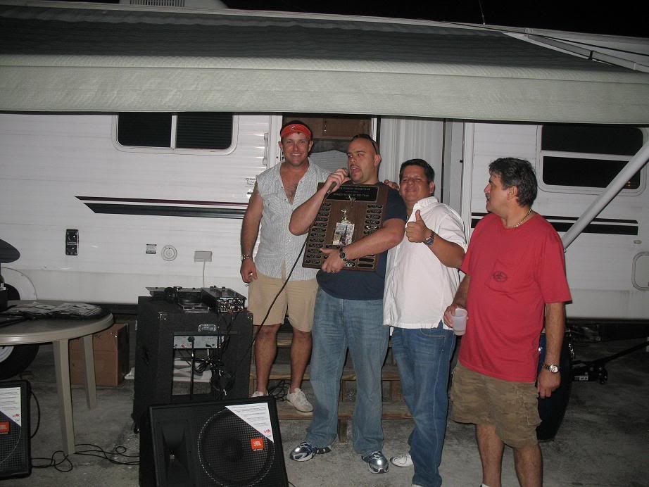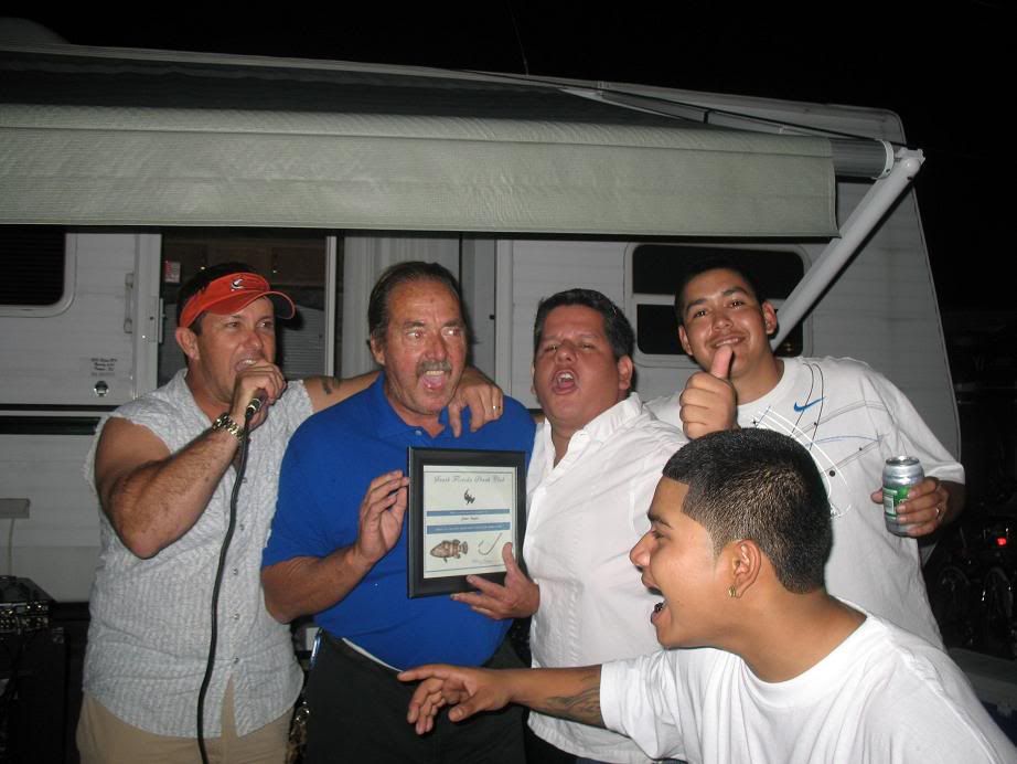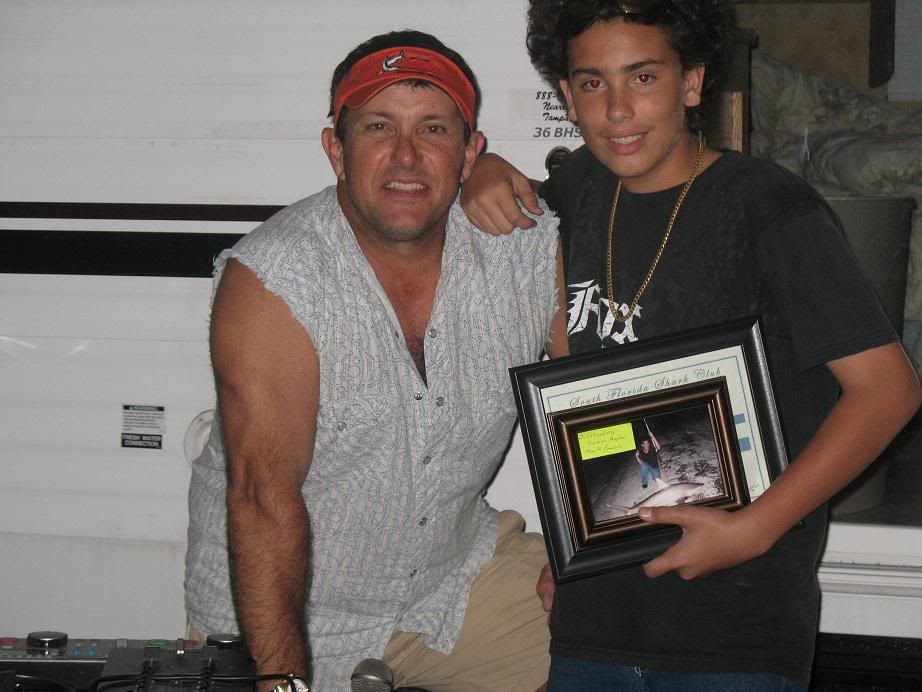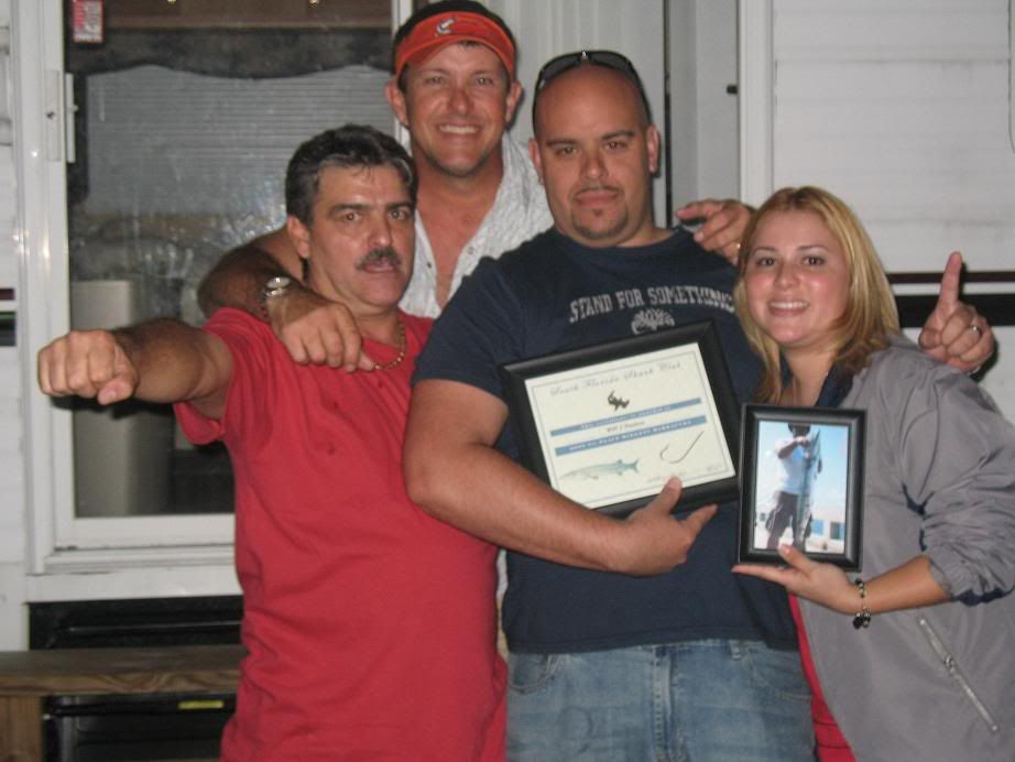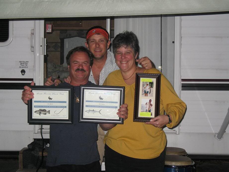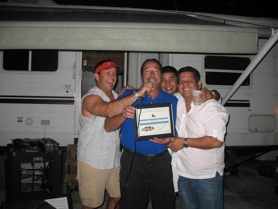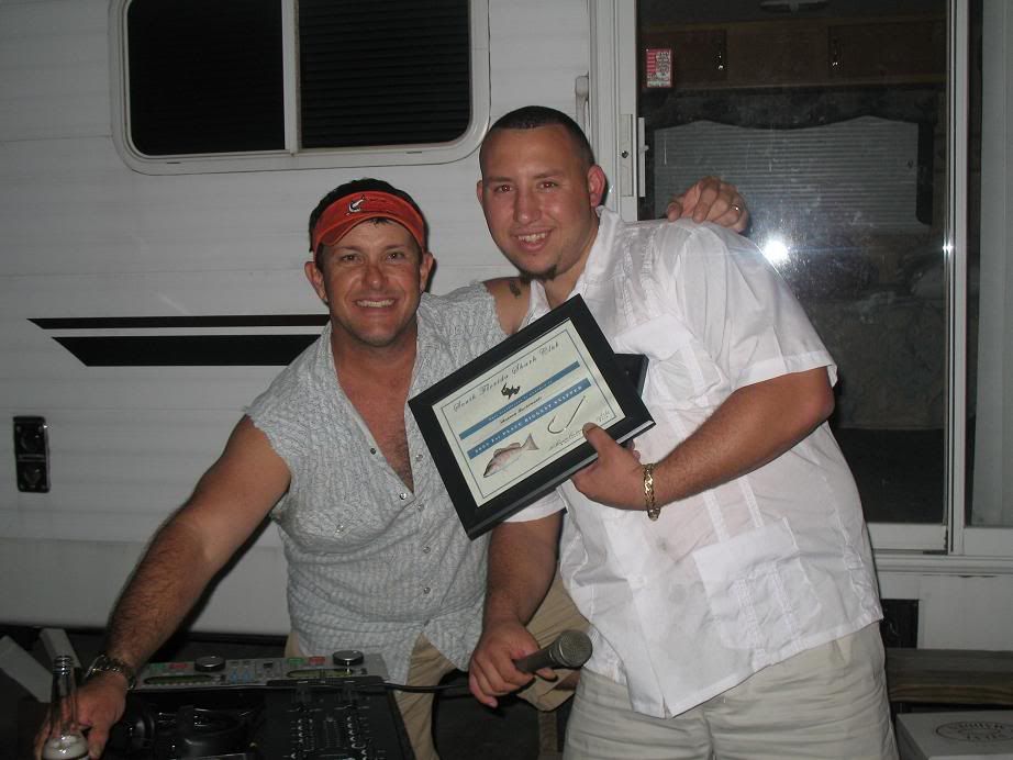 Jimbo recieving his trophy for most sharks caught during the year and 2nd place biggest Lemon shark of the year-tied with Aaron Bunch 9 ft 2 inches.