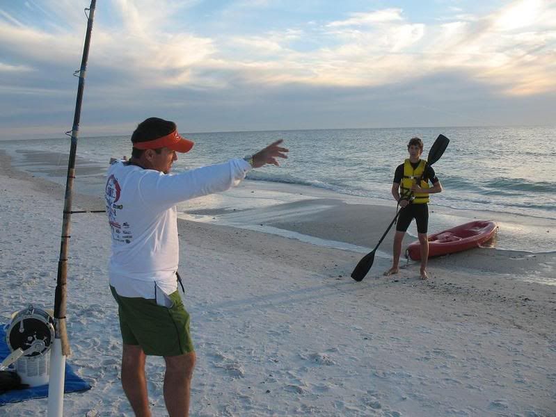 When you have a strong current flowing down the beach caused by high surf or you happen to fishing close to an inlet you will have to start your drop way down the beach from where your shark rods are set up so that when you drop your first bait you will be almost in front of your camp and then the second bait will be dropped away as the current takes you down the beach and so forth .Keeping your baits separated means staying Tangle Free.Spread out the fisherman holding the shark rods as you paddle out.Trying to fight the current with two baits weighing 30 pounds tied to your yak is futile so learn to use the current to your favor.Anticipate where the current will take you then make your adjustment before you jump in the yak.