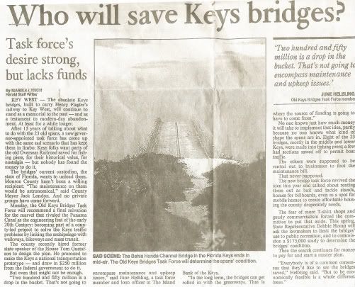Interesting article, I think the bridges are maintained by the state now as part of the Florida Keys historic trail (or something like that), personally I'm glad they haven't been improved or privatized with bait shops, etc, it keeps some of the crowds away. I do fear that eventually they will be all shut down, like the north end of 7 mile was recently, when the state determines them to be structurally unsound and won't pay to have them repaired.
