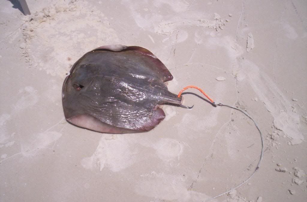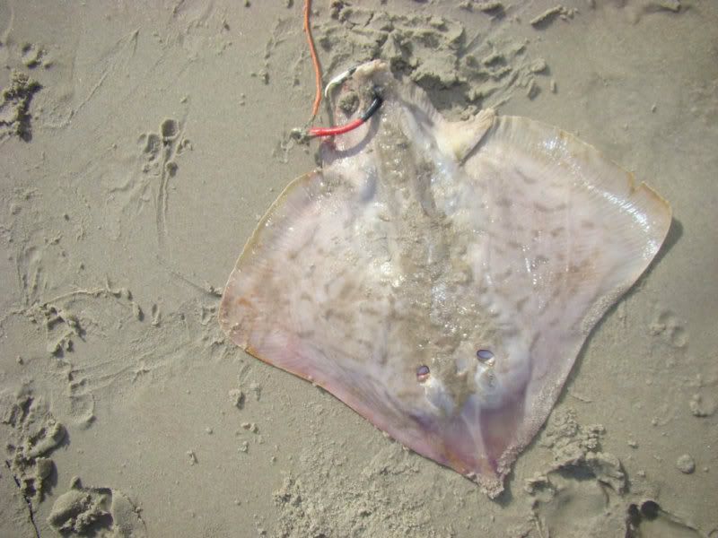 Yea I do but 95% of the time my BIG ray baits soak and soak and soak with out ever turning a click However the big baits like Tuna heads, wahoo heads usually get the big old slug sand Tigers. Caught some good Sand bars using pretty good size whole skate. One of these days my 20lb whole ray will get hit from the sand in MD. We dont have the best of odds on hooking a 10+ foot fish from the MD sand.... but in the ocean theres always that chance a true MONSTER will show up in the surf zone on any beach! ya know! Beaching a massive MD shark like Tiger, Hammer or a 10 foot plus Dusky is a goal of mine, so I will continue to drop that big old 20lb ray every chance I get.