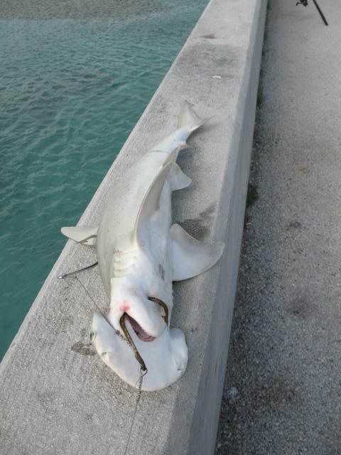 Many times when we are fishing and low on shark bait we will use a live bonnethead shark for bait if someone in our group happens to catch one.A live bonnethead is an excellent big shark bait that has turned a slow day of shark fishing into an unforgettable memory.We have caught some big sharks using live or dead bonnetheads but we have been burned many more times by sharks too big to turn on a Florida keys bridge.On the keys bridges and all the east coast piers it is a well known fact that a live bonnethead will usually get a big hammerheads attention when a dead bait is being ignored.When fishing the bridges where there is a strong current always try and hook your primary hook in the sharks mouth so it will swim into the current naturally and also in order to keep the water flowing through the gills of your live shark.I always prefer to use two hooks when freelining a live bonnethead because even a 10 foot hammerhead shark has a fairly small mouth and you want to hook your shark no matter what end he grabs the bonnethead.You should always keep your star drag clicker tighter then normal when setting down your rod because your typical bonnethead shark can exert pressure jerking your line in the current and rushing under a bridge or pier and tangling you up in the pilings.The best part beside catching a big bull or hammerhead shark on your live bonnethead is the fact that you can fillet your bonnethead since they are excellent eating.