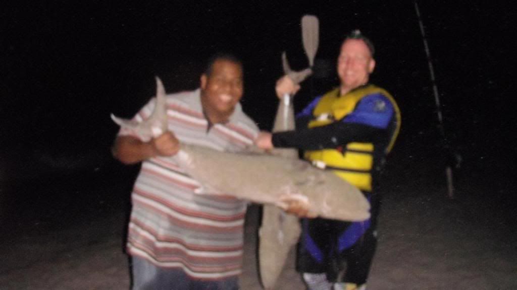 Here is another black tip from Hammer Fever. I happened to hook a monster again, that ate an 80lb amberjack head and stripped me from 3/4 spool on my 14/0 to 25 yards of line left on my reel. the monster got caught on some rocky bottom and eventually popped me off, even after my attempt to kayak the full length of a 14/0 out in the pitch black night to try pulling her off the bottom.