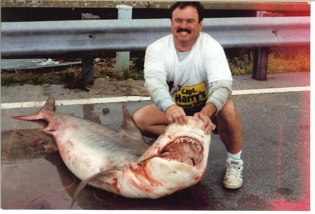 Luis Iglesias is one of the senior members of the south florida shark club since the early 1970's and has caught many big sharks from the bridges in the keys.One of his biggest is this 10 foot 8 inch Tiger caught from the key west side of Long Key bridge in the early 1990's .Few shark club members put in as much time on the bridges as he does and Lui has the distinction of being one of only a handful of shark club members who has caught tiger sharks from the Seven Mile bridge and Long Key bridge. He was fishing the outgoing tide with a big chunk of fresh caught barracuda.He fought the shark for over an hour in between the light poles and at the end of the battle with the help of Julio Terzado they were able to gaff the shark and walk it to the end of the bridge to haul it over the seawall.