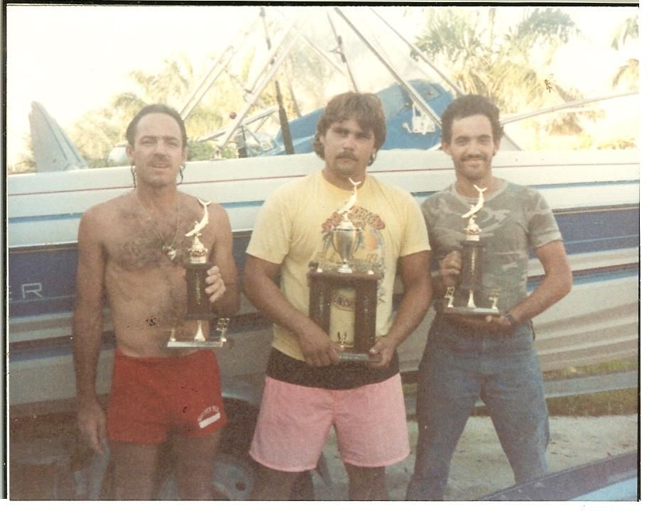 Rene (L)and Peter Alvarez (center)pose with some freshly won shark fishing tournament trophies -1988