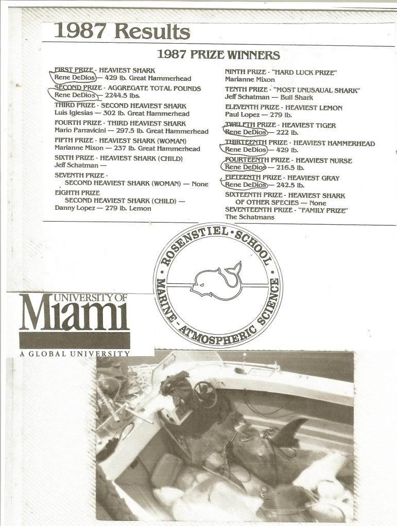 Always at the forefront of anything related to shark fishing in 1987 Rene de Dios the south beach pier phenom was very excited when he found out the University of Miami (Dr Sonny Gruber)was hosting a shark fishing tournament and Rene wasted no time in letting everyone know "he was gonna win the whole thing", and he did.It worked out perfect for Rene who at the time owned a double wide trailer on the water in Taverneir Key where he he kept his boat in frequently fished Mollases reef and the Duane wreck a choice place for monster sharks of all types.Close to Molasses at nearby Pickles reef a 15 1/2 foot great white was caught by commercial longliner Joel Prouty a few years after the the First Annual UM shark research Tournament in 1987.Rene slayed the field with the help of his team of nutty crew ,his knowledge of the local waters and a secondary boat dedicated to catching lhim live cudas all day.They would even swim baits out away from the boat.