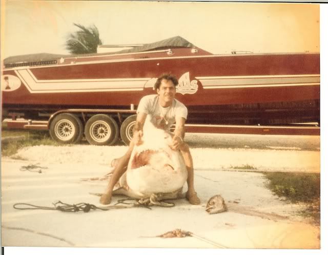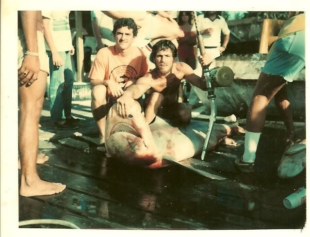 Rene de Dios is gone but is never forgotten for those of us that fished with him and loved him. For me it's an honor to share his story and the pictures and the many fascinating details that that was the life of the most extraordinary land based shark fisherman ever.It's difficult for me to put into words the drive and passion with which Rene fished.He was the driving force behind the shark fishing scene on that old south beach concrete pier.Everyone who met him and watched him in action was impressed with his charisma, and infected with his fervor to fish for sharks.People would come out to the pier just to watch Rene hook and fight sharks.Rene's brand of enthusiasm to catch sharks was contagious to the young man that saw him in action.The guys on the pier respected and admired him and came to him for advice with the shark fishing. I remember the first time i saw him doing battle with a shark i was mesmorized and went out and bought my first reel a Penn 60 to start shark fishing "just like Rene." To me my Penn 60 seemed puny next to that monstous 14/0 rene used but after that i knew i was on my way to becoming a red blooded shark fisherman "just like Rene" Keep in mind the pier was free and so all the guys used to go there to hang out,skateboard,surf,spearfish,but once they saw the maniac fighting a shark they too wanted to become shark fisherman.All the fisherman on the pier would watch and hear Rene "the BIG KAHUNA" as he called himself talk about the monster he's gonna catch tonight and people knew that he would do just that.Next day Rene's picture was in the Miami Herald with some big shark he'd caught just like he said he would.Rene would hound anyone with a fresh caught jack crevalle or blue runner so he could freeline it on his shark rod.Many times they would give in to the shark fisherman with fire in his eyes just to get him off there back.He was never rude just extremely driven. It got to the point when on any given summer night there would be 15 shark rods lined up on the end of the pier and Rene was the center of attention orchestrating his followers or playing a prank on one of the rookie sharkers.It's Hard to describe the vibe that was there but anyone who lived though it remembers it well.Rene had an uncanny feel for the seasons and what days of the month were gonna produce what type and size sharks. You may ask yourself why so many pictures of one guy with so many sharks but the fact was that Rene was in a league of his own,,in other words he caught so many more sharks then anyone else because he was that much more determined, that much more driven.When everyone else got tired and left at 1 or 2 am Rene would not leave til after sun up or even til high noon. At that time no one could compete with the fierceness with which he practiced his sport.Rene was a superb athlete who became a lifeguard for the city of Miami Beach municipal pool for two summers.I can't remember how many times Rene jumped off the pier to save a drowning swimmer,,at other times Rene would have to go out on a longboard to save one of our buddies whose aluminum row boat was sinking from taking a few waves over the bow while taking out shark baits.Rene was like Tarzan on the south beach pier no one could outfish him and no one was a more ballsy or as superb an athlete as Rene.Some people are born with a gift,a special talent and they only come around I believe once every century,,,just like no one has matched Michael Jordan no one has matched Rene de Dios.