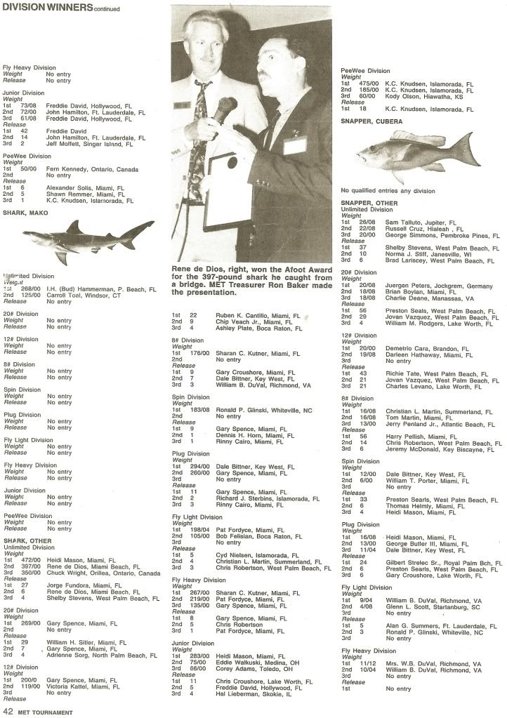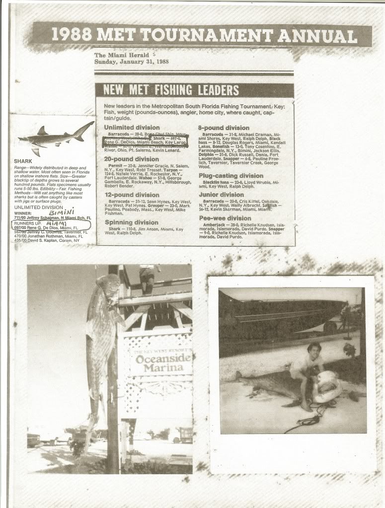 If there was anything that would propel Rene to gain shark fishing recognition Rene would get involved.The Met Tournament was the longest continouis running fishing tournament in the world when it was in existence for over 70 years the Miami Herald held it from Dec-May of each year and one of the categories was for sharks .Rene fought hard to win the biggest shark award award or the Afoot Award given to the angler catching the largest fish from shore every year.No small feat many years Rene would place in the top 5 for biggest sharks but it was tough to compete against the professional guides fishing out of Key West ,,,,guides like Ralph Delph and Ken Harris(world record holders) fishing with monied customers like Mark Sosin,Pete Pate and other world class fisherman all vying to win the Master Angler award by seeking out the largest of sharks on the flats using plug casting,spinning and even fly fishing gear to gain points.Rene became famous because he knew how to excite the media (he was a showman)and because of his shear determination to become one of the best all time shark hunters.He was extremely focused, dedicated even obsessed was a word that could be used to describe his push to win at all cost and often in the face of adversity.
