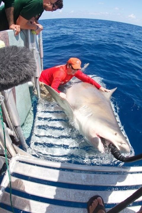 Something is out of wack with these pictures (IMO).In both pictures the pectoral fin he is holding in his right hand is huge,but the dorsal fin in his left hand looks puni and not of a large bull shark of this size.Another question I have is why thet did not announce an overall length?If and when a shark researcher scientist catches a large specimen at the upper limits for that species should'nt they provide as many details as possible so there colleageus in the same field can update information?