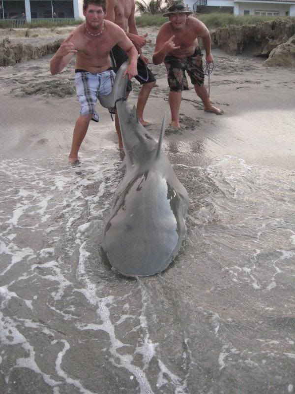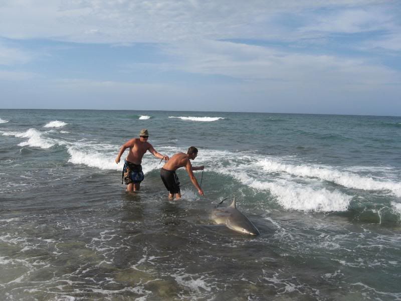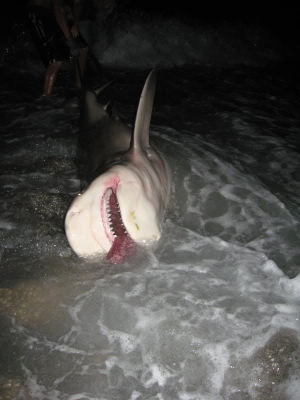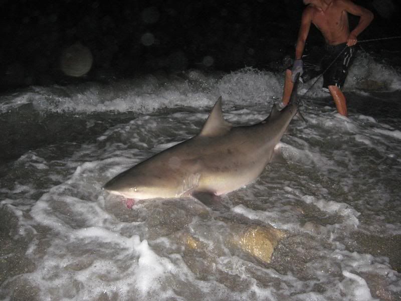 and lost a nice hammer to a boat but thats fishing.....we roped this fish with about 30 just pupped out bulls swimming at our feet...we could get a girth measurement with just 3 of us there the fish was so fat probably had an 8ft girth and was a close to 12 ft !! I later fiound out that bulls under stress will pup out which was very intresting. We caught 3 fish over 500 that day the smallest one being taped out right at 500 mark.