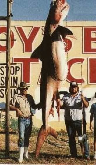 Another Shell Island Tiger 12 foot 6 inches caught by Corpus Cristi angler known as Grizz.This picture was used on a Roy's Bait and Tackle(Texas) post card.This huge Tiger is a fine example of the monster shark's caught from the Texas coast.