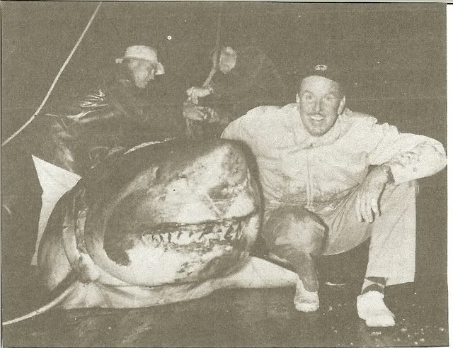 Bob Dyer's stands beside his 2342 pound white pointer that was the 130 lb line world record in 1958.