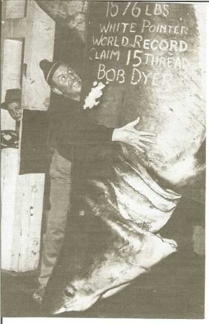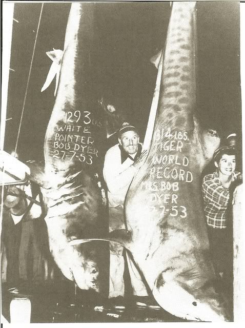 Bob and Dolly Dyer were a couple who broke many of Australia's great white shark and tiger shark records back in the 1950's.Many times Alfred Dean would have a pending world record and Bob Dyer would break it the same year .The competion between them was fierce.At one time they held more IGFA world records than any other husband and wife team.For a ten year period during the 1950's this couple was at the top of there game in and around the waters of Cape Moreton South Australia.They were determined to break the world record for a great white shark and many thrilling stories emerged from battles with record monsters.One exciting account describes the capture of Dyer's IGFA world record white shark on 130 lb test line in 1958.He had just beaten Alfred Dean's record by a mere nine and one half pounds with a white that weighed 2342 1/2 pounds.One of the all time greats for sure.